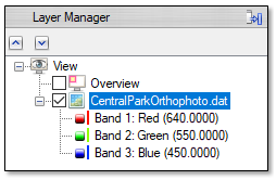 The Layer Manager shows datasets that are displayed in the view. Since there is only one view (you will learn about multiple views later), the image layer is listed under a single View category. The CentralParkOrthophoto.dat layer lists the bands (1, 2, 3) that are used to display a true-color composite.