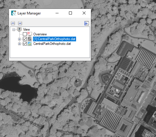 In the Layer Manager, right-click on [1] CentralParkOrthophoto.dat and select Remove. Now the view only contains the true-color image.