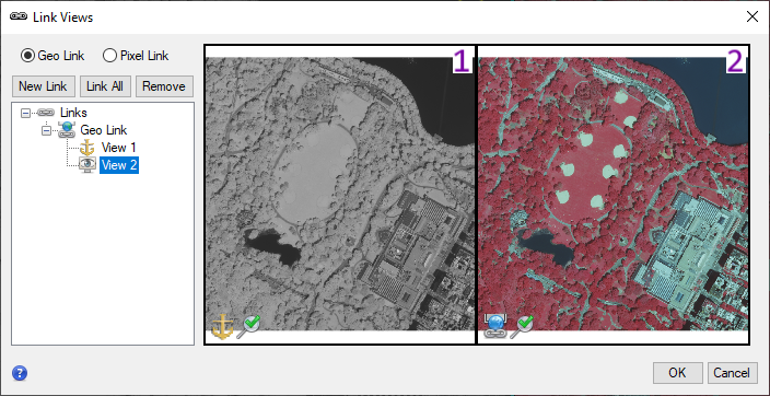 Having two views provides a convenient way to compare images side-by-side. However, notice that when you zoom or pan in one view that the other view remains the same. You will need to establish a geographic link between the views.
