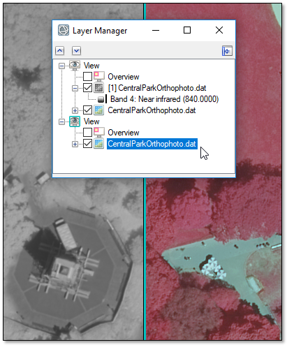 Right-click on CentralParkOrthophoto.dat in the Data Manager and select Load CIR. A second view is added to the view, which contains a color-infrared version of the orthophoto. The Layer Manager shows that a second view has been added.