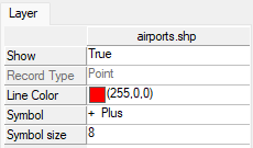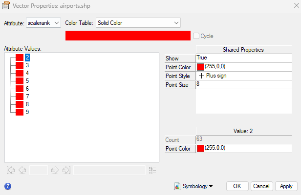- When you display a vector file for the first time, the Vector Properties dialog assigns a default fill color of red for all attributes.