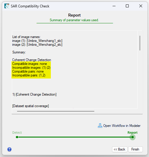 Some tools such as SAR Coherent Change Detection have strict requirements for viewing geometries. The SAR Coherent Change Detection help topic lists these requirements. Rather than review image metadata (provided as JSON files) to determine suitability for Coherent Change Detection (CCD), you can run the SAR Compatibility Check tool. The Report panel lists all image properties, geometry requirements, and whether or not the images can be used for CCD. Thus, SAR Compatibility Check is a great tool for reviewing image properties--such as incidence angles, orbital directions, and footprint areas--if you are unfamiliar with your images.