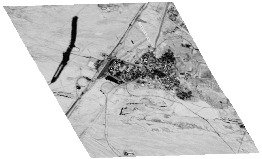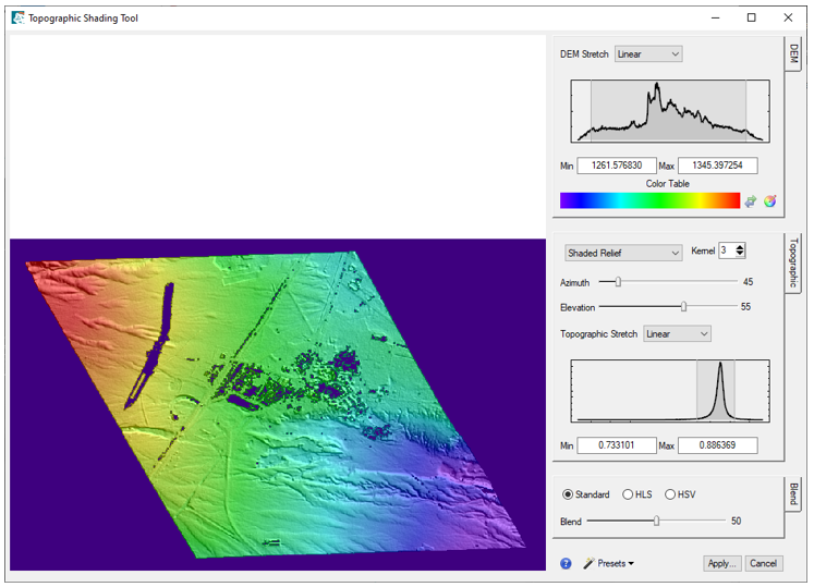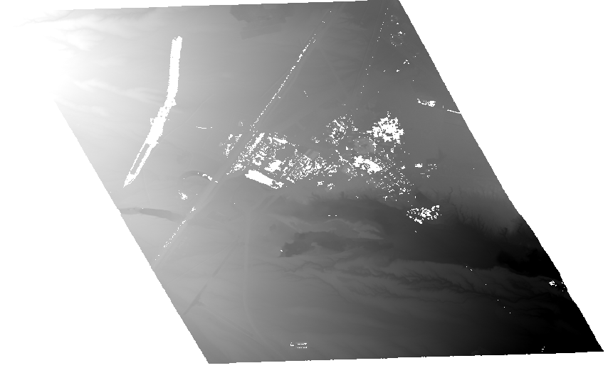Tip: Viewing the DSM as a grayscale raster is not always intuitive, nor does it reveal masked pixels well. Consider using ENVI's Topographic Shading Tool to create a color shaded-relief image from the DSM. This is a good way to visualize elevation data. For more information, see the Topographic Shading(opens in a new tab) topic in ENVI Help.