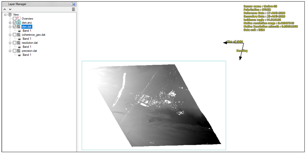 dsm.anz: Annotation layer showing the line-of-sight (range) and heading (azimuth) directions, along with basic metadata. You must zoom out of the view to see the annotation layer, which is displayed to the upper-right of the DSM image in the Image window. * •