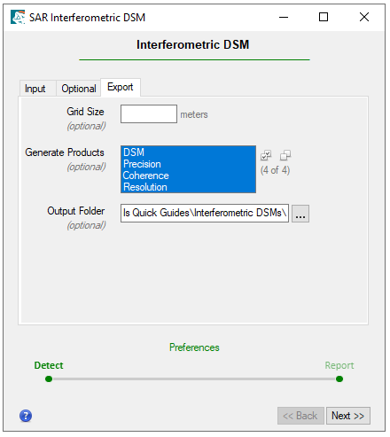 In the Coherence Threshold field, enter a value of 0.5. This value specifies the level of quality and precision in the output DSM. Values can range from 0 (lowest quality) to 1 (highest quality). Pixel values lower than the specified coherence will not be considered for DSM generation.