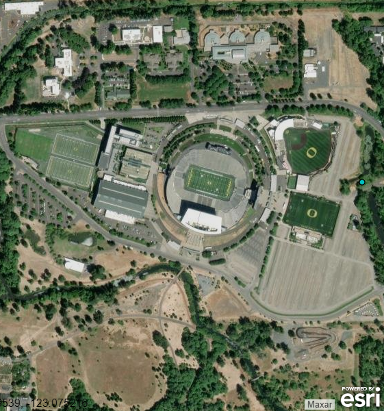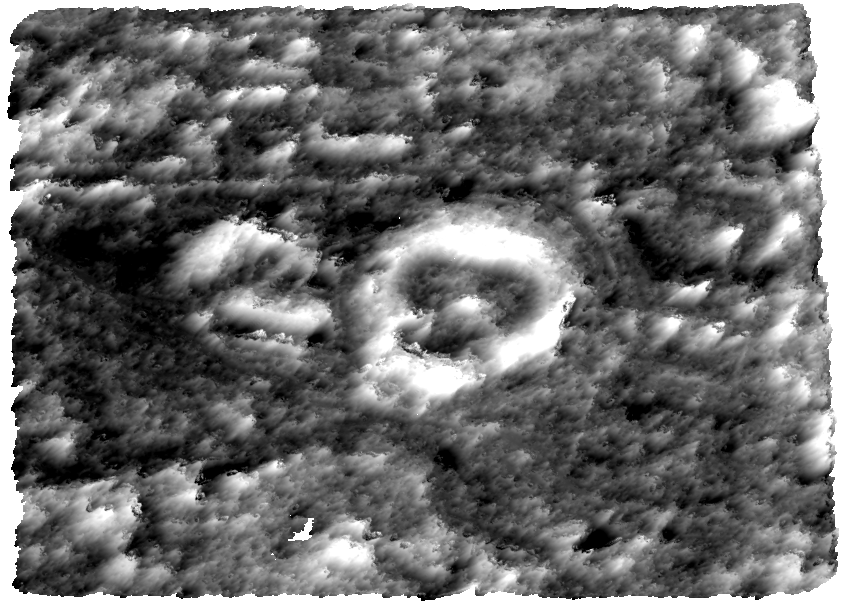 A DSM is different than a DEM or Digital Terrain Model (DTM) because elevation values include features that protrude from the surface. A DEM or DTM characterizes the topography of a bare Earth surface. A high-resolution DSM such as this one can reveal trees and buildings. Darker pixels correspond to lower elevation, while brighter pixels correspond to higher elevations. The circular white object in the center is a football stadium: