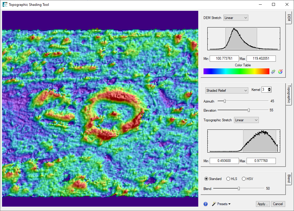 Tip: Viewing the DSM as a grayscale raster is not always intuitive, nor does it reveal masked pixels well. Consider using ENVI's Topographic Shading Tool to create a color shaded-relief image from the DSM. This is a good way to visualize elevation data. For more information, see the Topographic Shading(opens in a new tab) topic in ENVI Help.