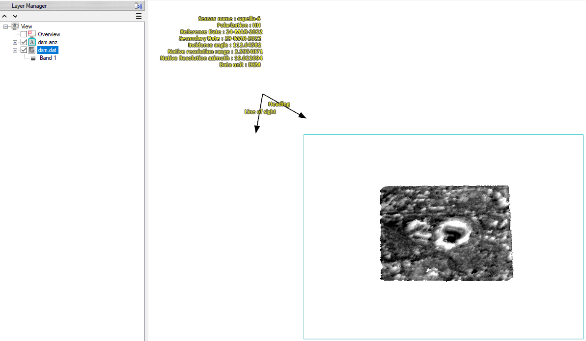 dsm.anz: Annotation layer showing the line-of-sight (range) and heading (azimuth) directions, along with basic metadata. You must zoom out of the view to see the annotation layer, which is displayed to the upper-left of the DSM image in the Image window. * •