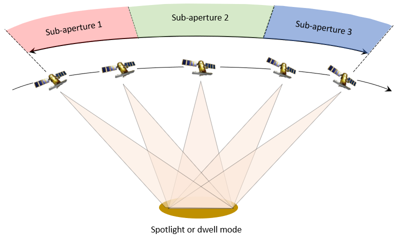SLC images acquired in spotlight or dwell mode can reveal moving objects such as aircraft, vehicles, and vessels. In spotlight mode, a SAR sensor’s antenna beam focuses on a specific target for several seconds as it passes overhead. The time it takes to receive backscattered echoes from the target during the flyover is called dwell time or aperture. Similar to spotlight mode, dwell mode focuses on a target for an even longer time period.