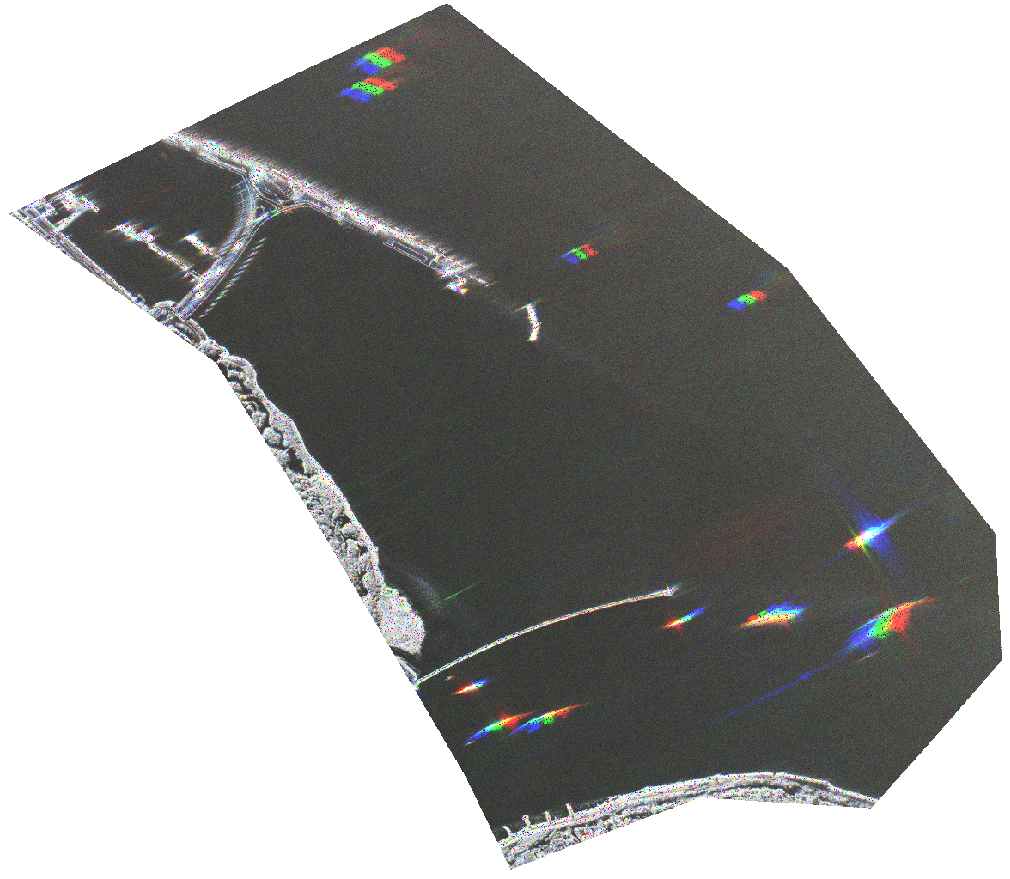 White features in the image represent stationary objects. Features with a red/green/blue color scheme in the open sea correspond to moving vessels. Movement along the azimuth direction causes defocusing and rainbow-like artifacts.
