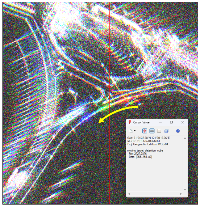 The SAR Moving Target Detection tool in SAR Essentials creates a color sub aperture image. For spotlight and dwell-mode acquisitions, the entire azimuth spectrum is split into three segments called sub apertures. Each sub aperture is associated with a specific antenna squint, or viewing angle. Each one is assigned a color to create a red, green, and blue (RGB) composite image.