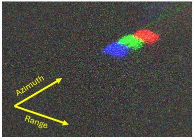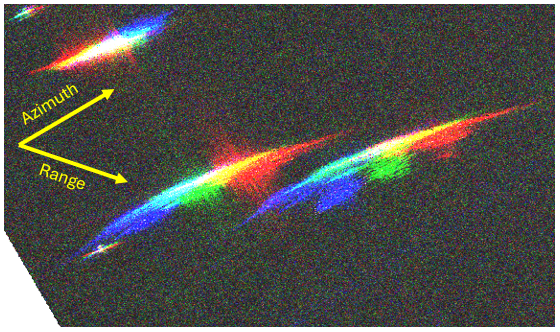 Colored streaks in a sub aperture image indicate objects moving along the azimuth direction (the satellite flight direction), or having a motion component in that direction, as the following figure shows: