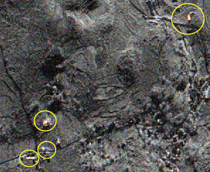 Uniformly colored sub aperture images also help to distinguish man-made objects from the surrounding natural environment. Pixels with bright colors often indicate man-made, anisotropic (directional) objects that exhibit strong backscattering. Their colors and brightness differ according to their direction relative to the squint angle of the sensor.