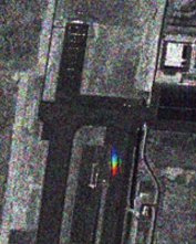 In the Go To field of the Toolbar, enter pixel coordinates 1326p, 3049p. The red crosshairs center on some vessels docked along the pier. Colored streaks on both sides of the vessels indicate that the vessels may be rocking back and forth, or that their side lobes exhibit a strong anisotropic component. Examples like this must be interpreted with caution.