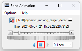 In the Layer Manager, right-click on dynamic_moving_target_detection_cube and select Band Animation > Raster Series. The Band Animation dialog appears, and a new raster series layer is added to the Layer Manager and displayed in the Image window. Animation begins immediately. You can see the vessels moving throughout the harbor. The vessels near the top of the image are drifting sideways, while the ones near the bottom of the image are mostly moving in a linear direction.