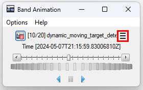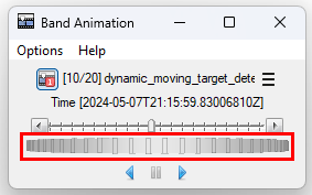 Click and hold the left mouse button over the "wheel" in the Band Animation dialog, then drag in either direction. This displays each frame (band) incrementally. Each one represents a unique viewing angle at a specific point in time during the spotlight acquisition.