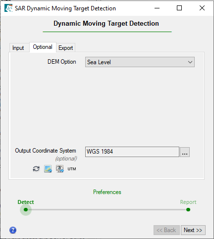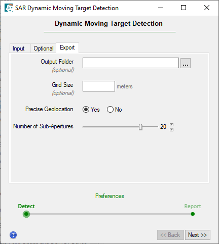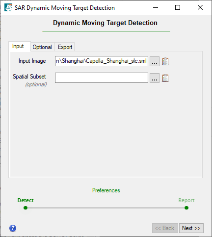 In the Toolbox, go to the SAR Essentials > Moving Target folder and double-click SAR Dynamic Moving Target Detection. The SAR Dynamic Moving Target Detection dialog appears. The Input tab is active. - 2