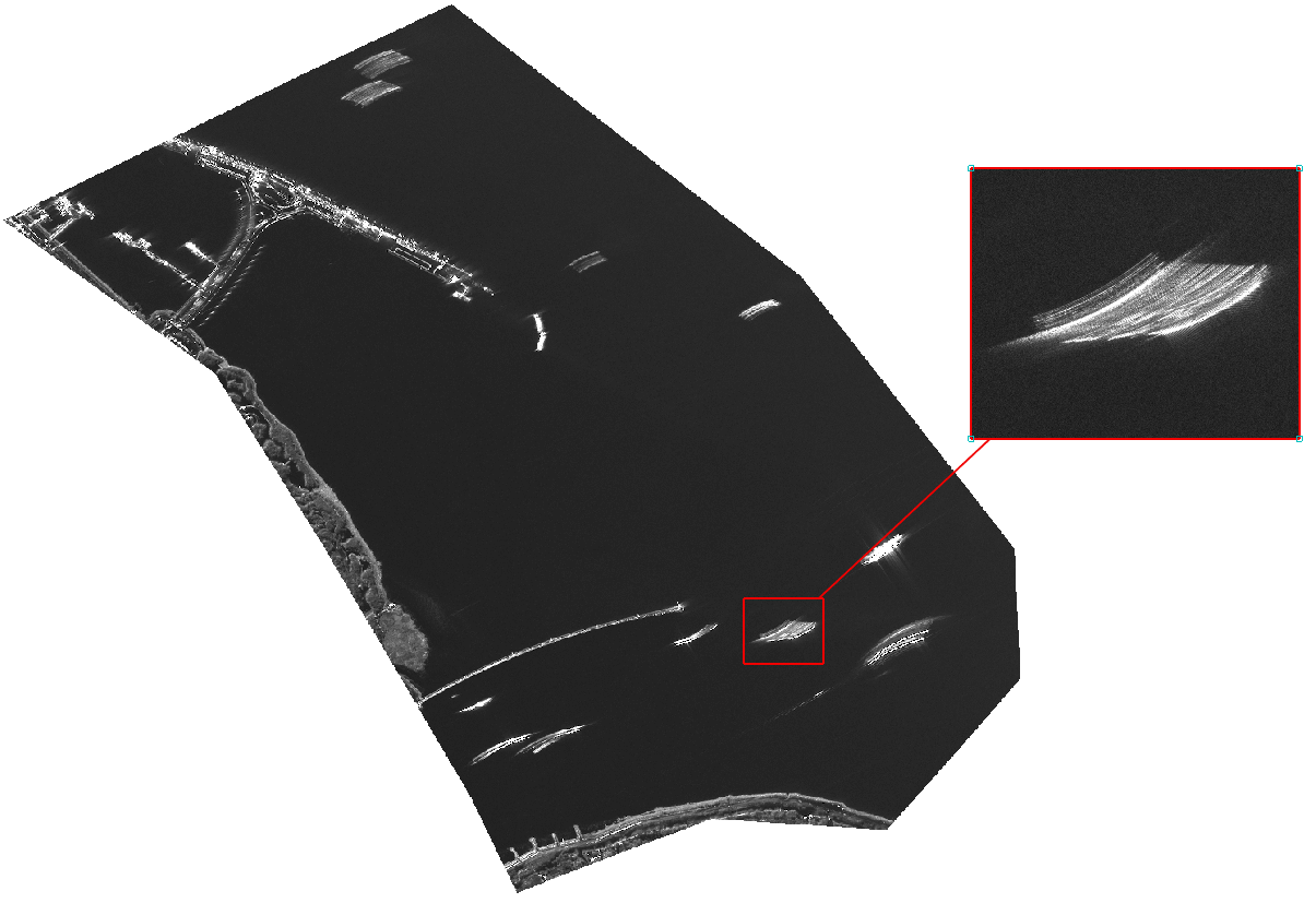 Below is a geocoded image created from the SLC image. Moving vessels are rendered as blurred, or defocused, objects. A dynamic aperture image will confirm that these objects are indeed moving.