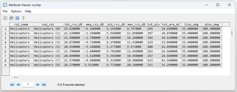 For this quick guide, you will use the SAR Radar Cross Section tool to estimate the RCS of military helicopters at a Russian air base. The tool reads and displays SLC power images and lets you draw ROIs around individual objects in the images. The tool computes RCS and other metrics from the ROIs and creates shapefiles from them. It then adds the resulting values to the shapefile attributes, which you can see in the Attribute Viewer. ENVI also annotates the RCS values for each ROI on the screen.