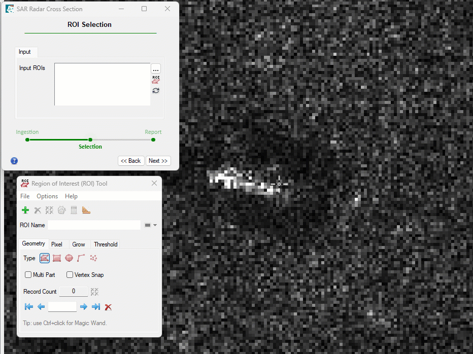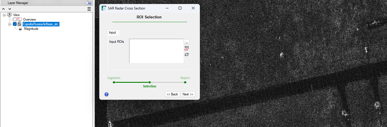 Click the Next button. After a few seconds, the SLC image is added to the Layer Manager and displayed in the Image window. The RCS tool advances to the ROI Selection panel.