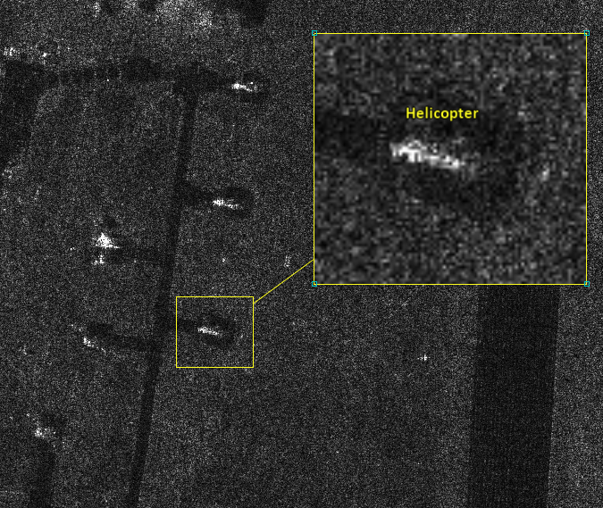 This scenario demonstrates how to start the SAR Radar Cross Section tool, then display the SLC image and draw ROIs around helicopters. You can also display the image and draw ROIs before starting the SAR Radar Cross Section tool, but those steps are slightly different.
