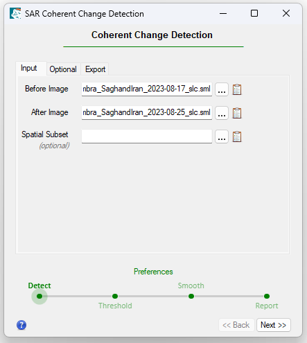 Double-click SAR Coherent Change Detection. The SAR Coherent Change Detection tool appears. The Input tab is active.