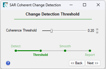 The Coherence Threshold value determines how much change the final classification image should show. Moving the slider toward the right (increasing the threshold) will classify more pixels as “Change.” Moving the slider toward the left (lowering the threshold) will classify fewer pixels as “Change.”
