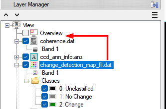 In the Layer Manager, drag and drop the change_detection_map_fil.dat layer above the coherence.dat layer.
