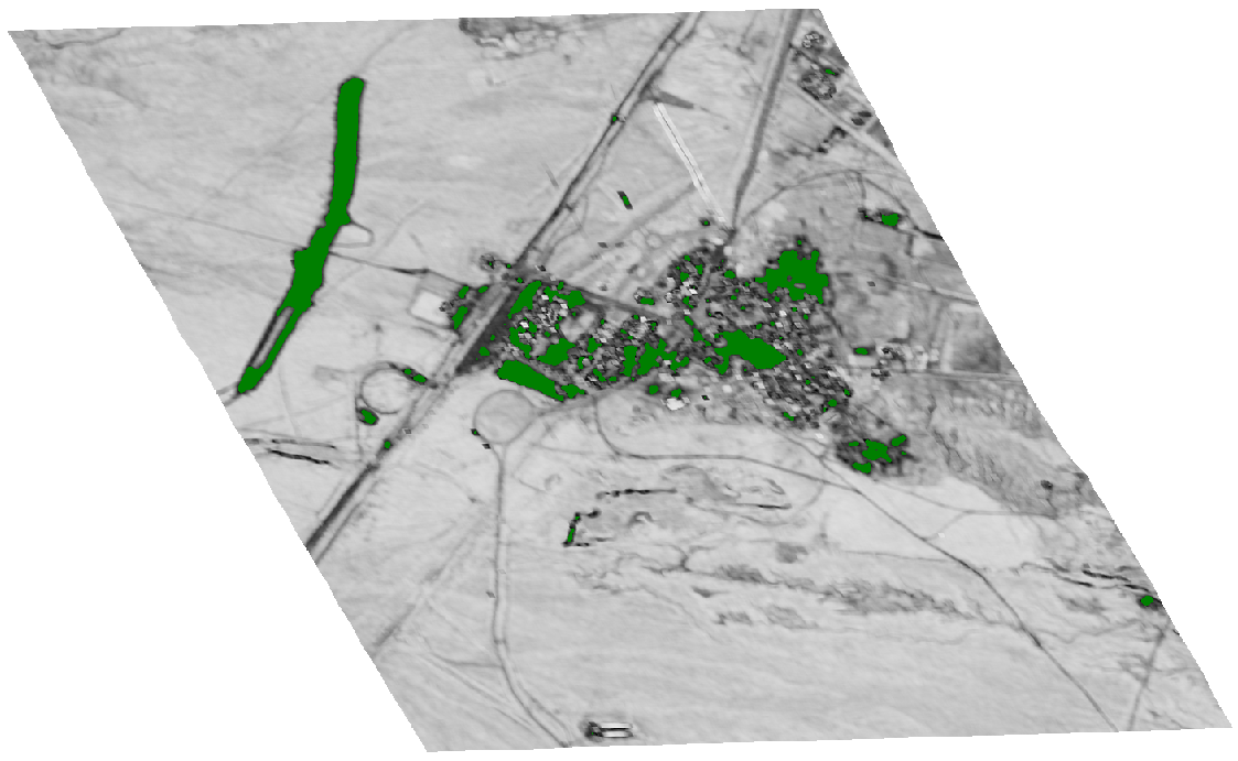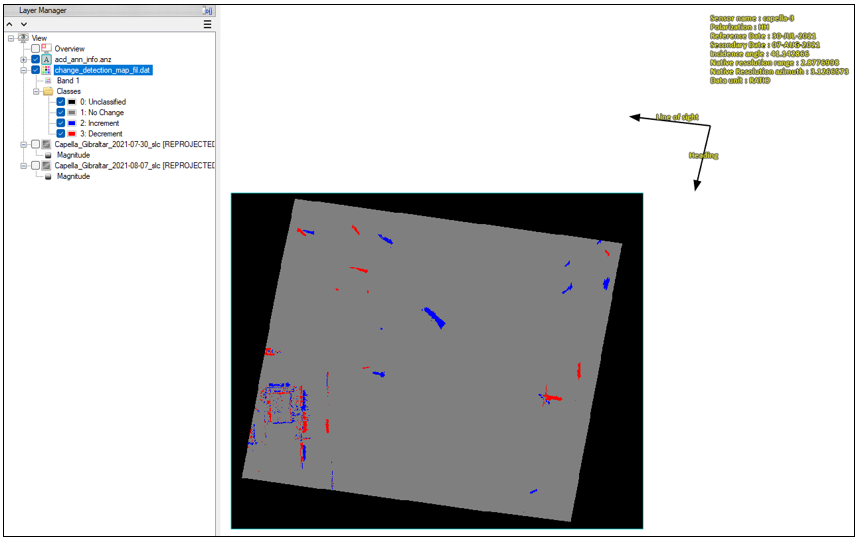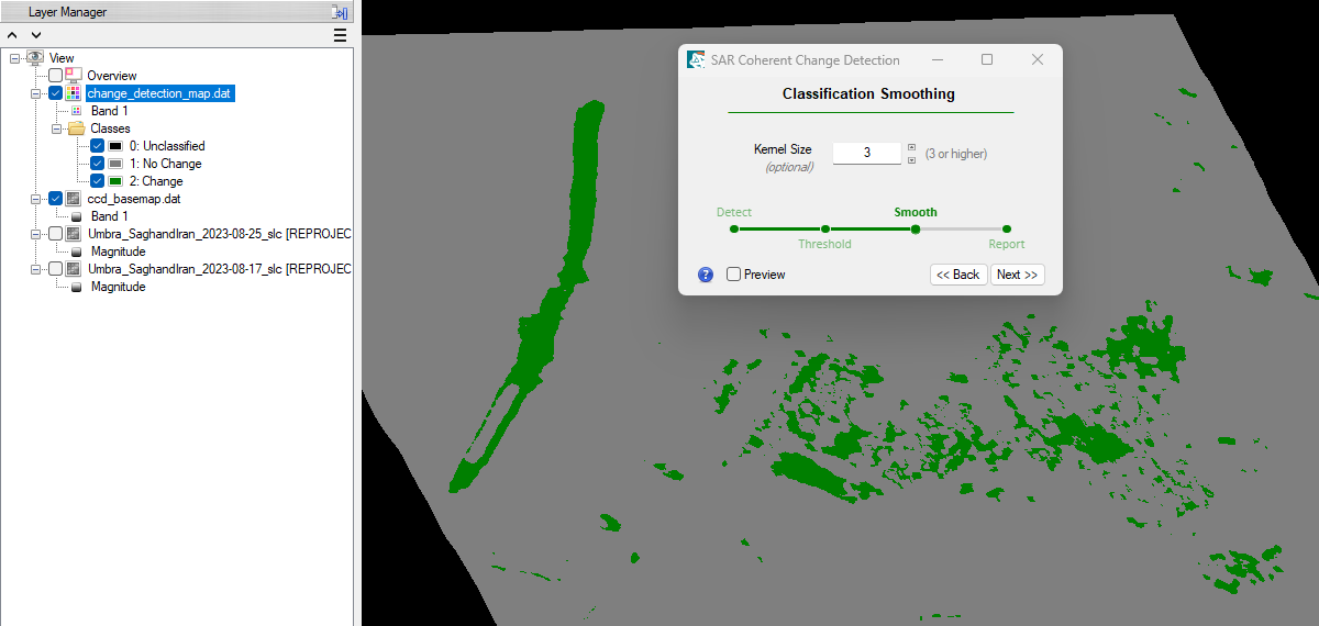 Uncheck the No Change and Unclassified classes in the Layer Manager. The green “Change” pixels overlay the coherence image.