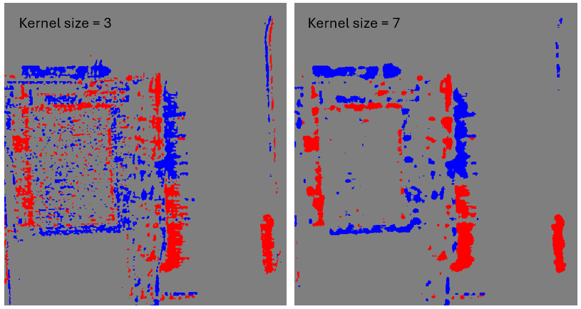 The defaultKernel Size value is 3. Enable the Preview option to see what the final classification will look like with this value. The image reveals more groups of “Change” pixels, but many pixels are still scattered. - 2