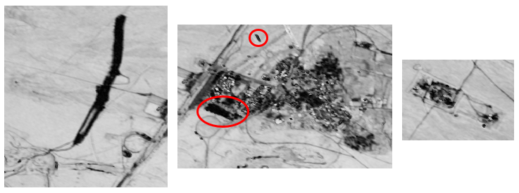 Coherence values range from 0 (low coherence, or unstable or non-reflecting areas) to 1 (high coherence, or stable areas). Thus, brighter pixels in the coherence image indicate stable areas, or those that did not change during the eight-day period. Black and dark-gray pixels indicate changes to the landscape that occurred during that time. The figure below shows some examples that are likely caused by excavation, soil disturbance, and vehicle movement. The black linear feature could be a trench. The coherence image definitely reveals construction activity in and around the village.