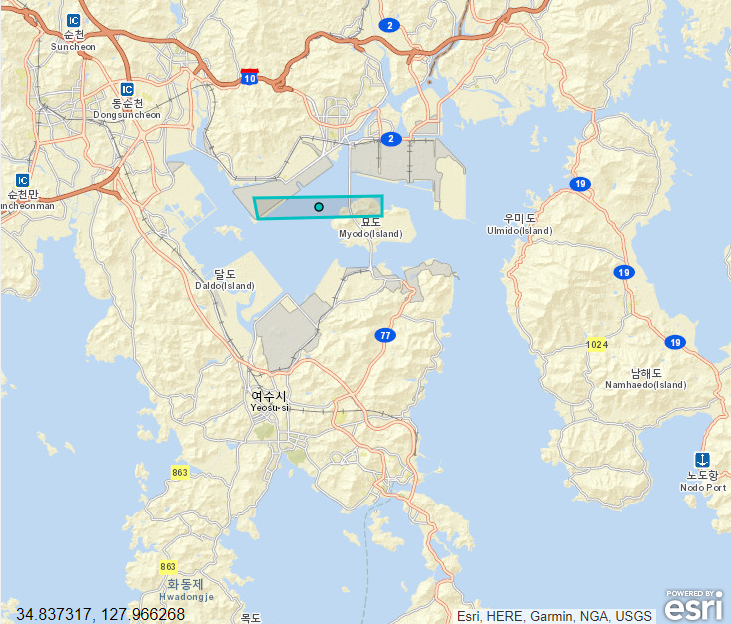 The SICD file you will use in this exercise covers a small area of open sea near Gwangyang Port in South Korea. In the map below, the image extent is shown with a blue border: