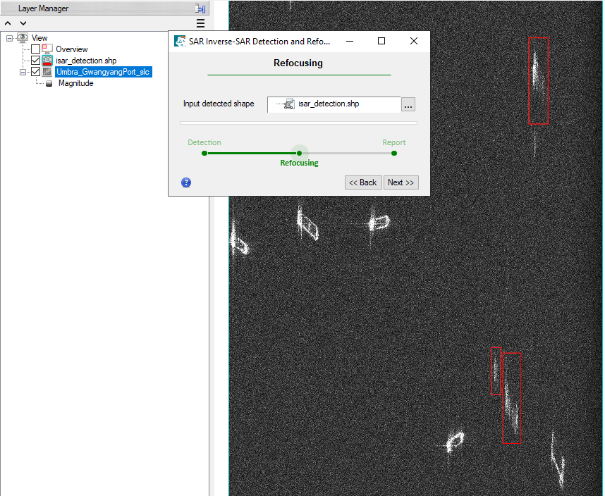 The SAR Inverse-SAR Refocusing tool is optimized to detect objects with minimal surrounding clutter; for example, vessels in an open sea or vehicles positioned on a road surface with low backscatter. Avoid using images that contain a mixture of vegetation, man-made objects, and other features that exhibit medium and high backscatter. The background should be homogenous, either water or land but not both. * •
