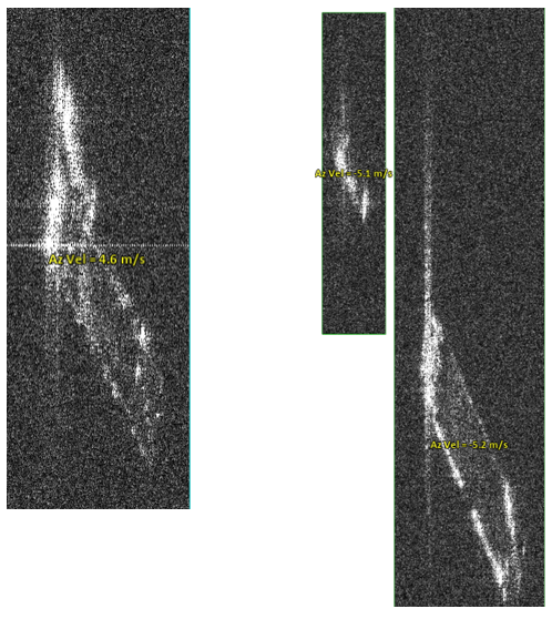 Zoom to each refocused object, evaluate its appearance, and note the estimated velocity (in yellow). Objects are displayed at full resolution with no multilooking. As a result, the objects are elongated along the azimuth direction. Future versions of SAR Essentials will produce multilooked, geocoded rasters so that objects will have more natural shapes.