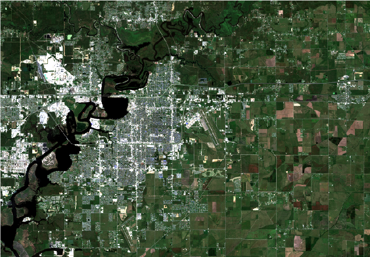 Go to the location where you downloaded the sample data, and select the files HurricaneDeltaAfter_2020-10-10.dat and HurricaneDeltaBefore_2020-09-30.dat. Click Open. The images are added to the Layer Manager and displayed in the Image window. They cover a large area around the city of Lake Charles. 3. 3