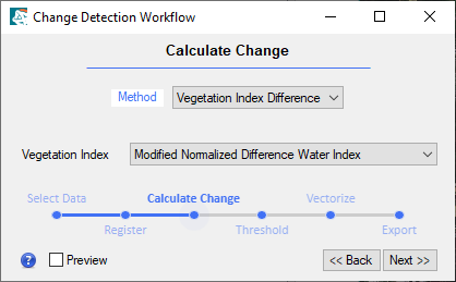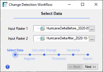 The images are already well aligned with one another. No image-to-image registration is necessary. Keep the default selection of Skip this step and click the Next button to proceed to the Calculate Change panel.