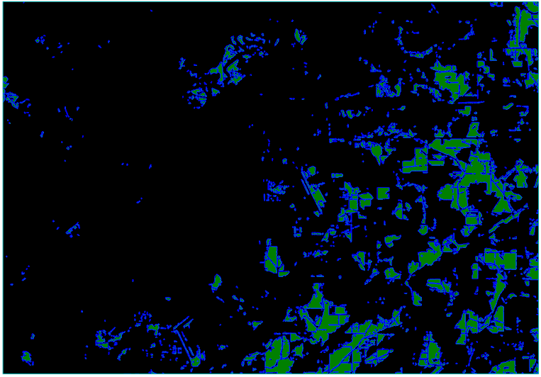 Click the Finish button. The output classification image and shapefile are added to the Layer Manager and displayed in the Image window. The shapefile has blue outlines. The classification image has two classes: Unclassified (black) and Change (green).