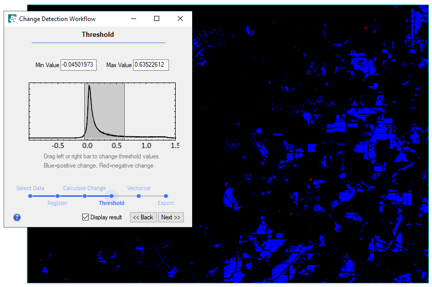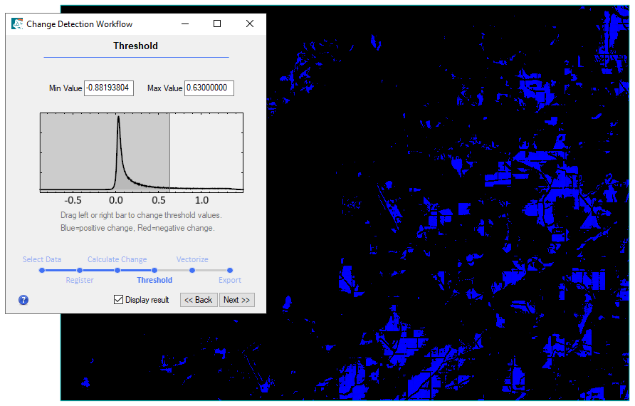 The Threshold panel displays a histogram of the MNDWI difference image. It determines a suitable threshold and displays the result in the Image window. Blue pixels indicate a "positive" change, i.e., increased open water extent. The few red pixels you see indicate a "negative" change, or decreased open water extent.