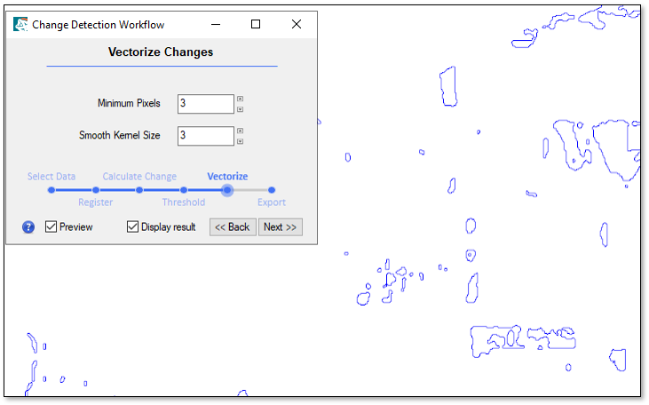At this step, the workflow will convert the blue pixels to vector polygons. The Minimum PIxels and Smooth Kernel Size parameters control the amount of detail the vectors will show.