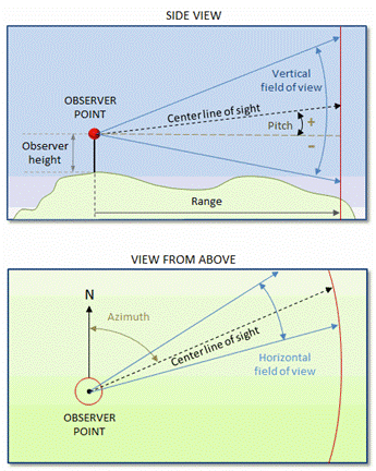 Experiment with different Observer Azimuth and Horizontal Field of View values. In the following example, the Observer Azimuth is 110 degrees and the Horizontal Field of View is 180 degrees. This faces the observer toward the road that runs along a southwest to northeast direction