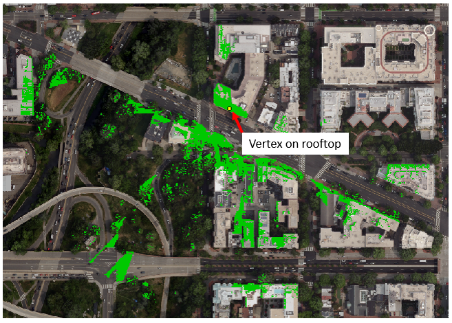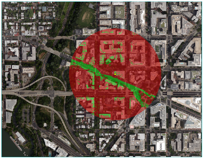 Click on any rooftop in the image that is adjacent to a major corridor. A yellow vertex is added as the observer point, and green pixels show what is visible from that point. The Vertex Color and Seen Color settings in the viewshed properties define these colors.
