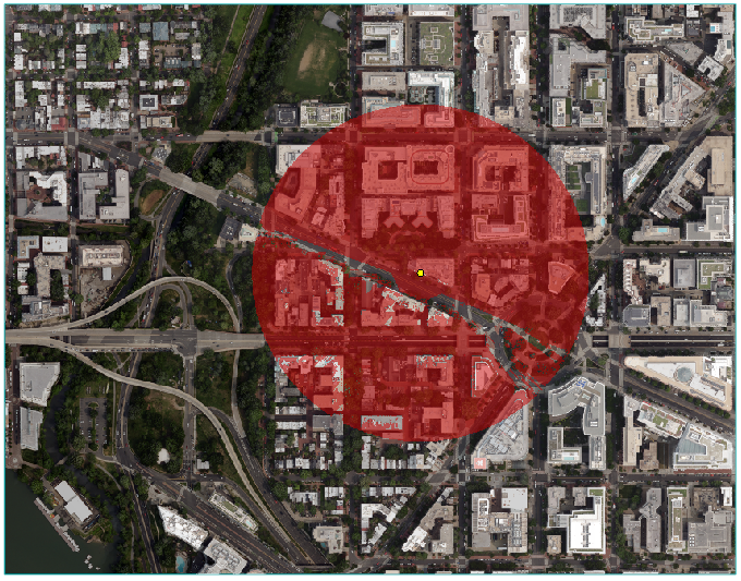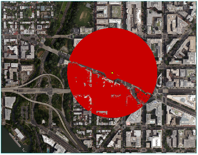 In the Viewshed Tool properties, change the Show Layers value to Hidden. The view updates to show only the areas that are hidden from the observer point. In the Layer Manager, the layer name changes from “Viewshed Seen Area” to “Viewshed Hidden Area.” With this change, pixels that are visible from the observer point are not highlighted with a color, and pixels that are not visible from the observer point are colored red. The following example shows a zoomed-out view, with a range of 250 meters.