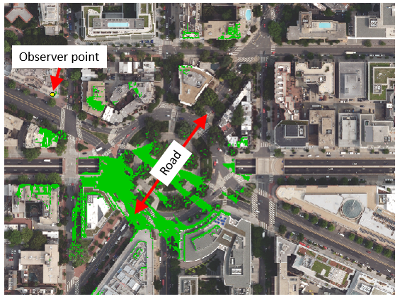Click and drag the vertex to another rooftop along the same road to move the observer point. The results show the new areas of visibility from the observer point. 2. 4