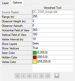 An Options tab opens in the bottom-right corner of the application. The Viewshed Tool properties are editable. They include the observer point height, horizontal field of view, and vertical field of view. You can change these properties at any time during viewshed analysis.
