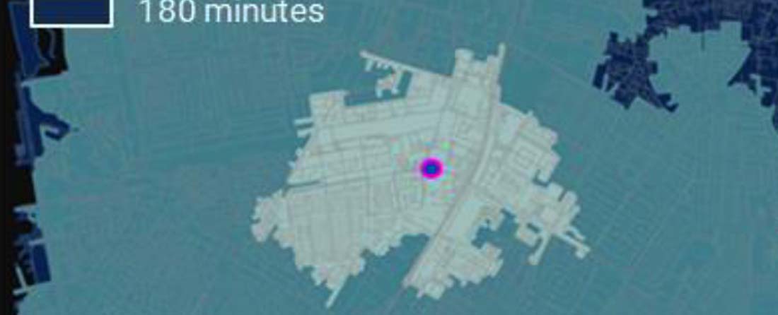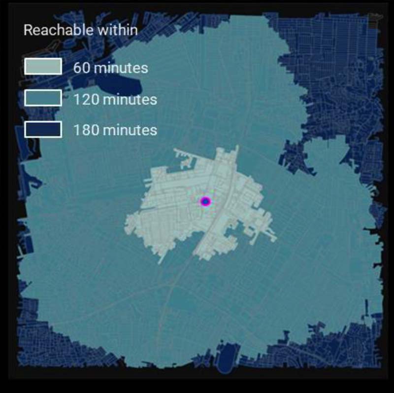 Figure 1 : Open-source-based time-distance analysis result. The target vehicle is located at the center of the AOI. The Open-Source algorithm is called from within the ENVI Ecosystem.