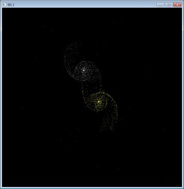 Essentially, two point masses represent galactic centers and 1000 mass-less test points (“stars”) are given initial circular paths around those centers. Both galactic centers then move relative to their center of mass with some initial conditions intended to provoke a visually appealing, if physically bogus, result.