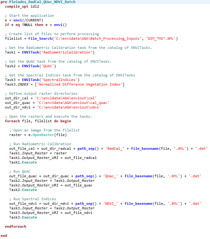 我的首选是 ENVITask 系统。ENVITask 系统是一种相对较新的方法,用于通过 ENVI 基于对象的 API 以编程方式执行离散的图像处理任务。这种图像处理的编程方法可以节省大量时间,因为您可以轻松地将多个 ENVITask 链接在一起,使一个 ENVITask 的输出成为下一个 ENVITask 的输入。您还可以遍历多个文件,因此无论您选择进行什么处理,都可以一次性地对多个图像重复执行。ENVITask 在 ENVI 5.1 中引入,并且可用 ENVITask 的数量随着每个后续版本而稳步增长。在 ENVI 5.3 中,ENVI API 中有超过 100 个可用的 ENVITask。要以编程方式运行 ENVITask,用户只需定义要执行的 ENVITask,定义 ENVITask 参数(输入文件、输出文件位置、其他任务参数),然后执行 ENVITask。有关可用 ENVITask 的完整列表,以及从 ENVI API 调用每个单独 ENVITask 的示例,请查阅我们的在线 ENVITasks 文档中心。