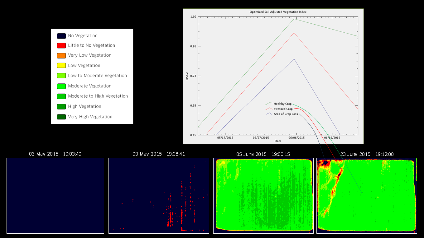 最后但同样重要的是,我想谈谈 ENVI 中新的序列剖面工具。一旦栅格序列被重采样到共同的坐标系和空间范围,我们就可以使用序列剖面工具真正深入地分析一个场景,以了解任何给定像素随时间的变化情况。在下面的示例中,我们使用我们的 Pleiades 图像处理结果来观察整个生长季节中的单个农田。使用我们的序列剖面工具查看优化土壤调整植被指数,我们发现作物健康状况稳步上升,直到六月中旬的某个时候。到 6 月 23 日,作物健康状况开始下降,我们甚至看到农田西北角有作物损失的迹象。这只是 ENVI 多时相分析工具如何洞察地面不易获取的条件的一个例子。
