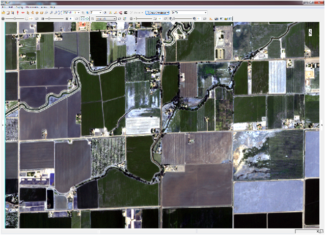 In this example, I am using an Astrium image courtesy of Airbus Defense and Space. I have pre-processed the image to ground reflectance and derived an NDVI image. With this image, the goal is to find the fields that are ready for harvest.