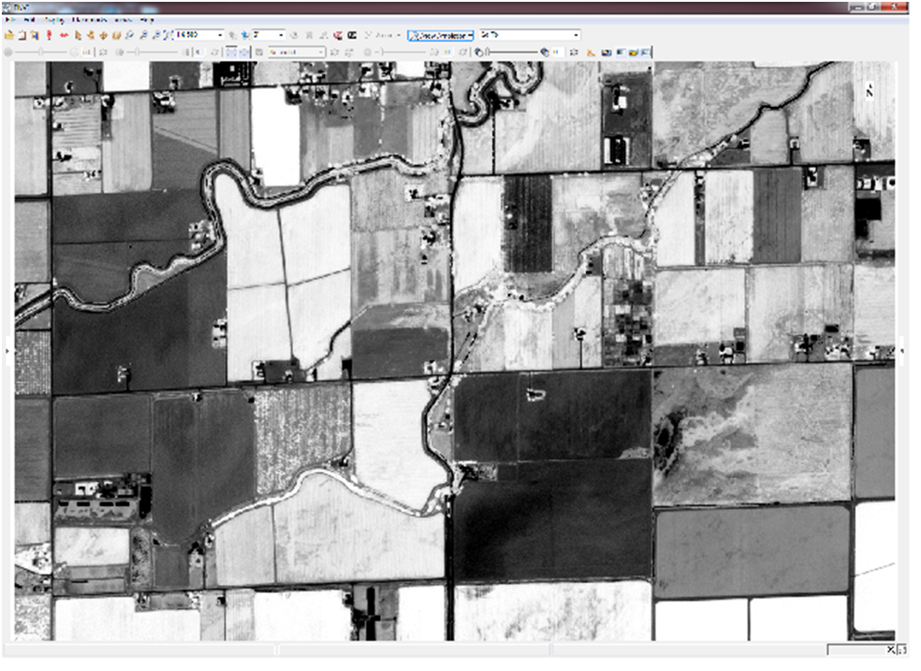 After my original analysis, I have a single-band gray scale NDVI image. I can see that some of the brighter areas are probably healthier fields, but it is not easy to derive context when the image is displayed in this way: